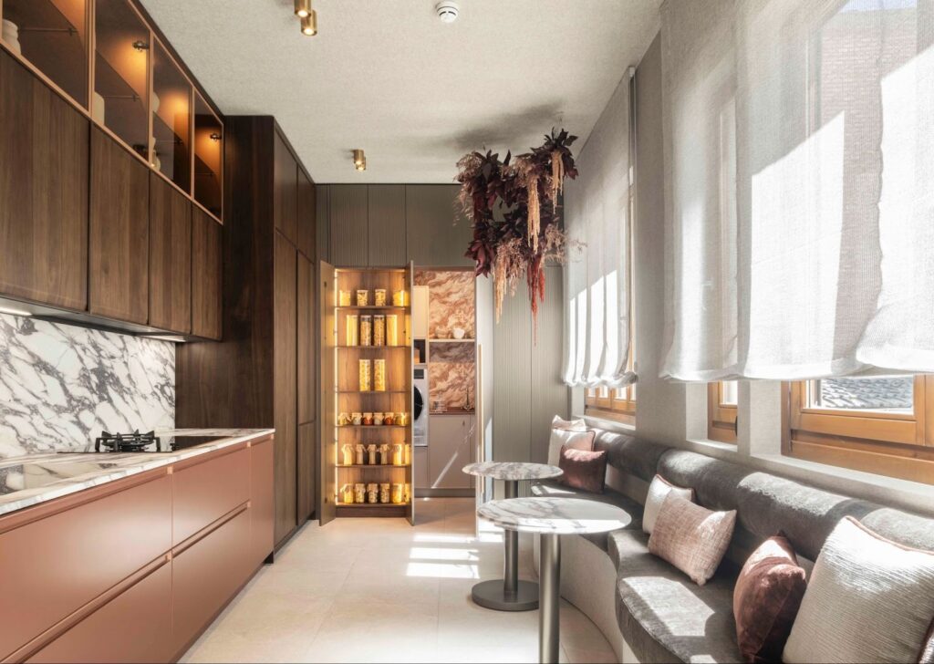 Bajo el concepto “La arquitectura del sabor”, el espacio se construye a partir de una combinación de materiales como la madera, el porcelánico y el latón, generando una narrativa rica en texturas. Elementos como la laca metalizada en tono terracota o la integración de la lavandería tras un frente de suelo a techo con puertas onduladas evidencian un cuidado preciso por el detalle. Los electrodomésticos de Smeg, integrados en columnas con acabado en madera, refuerzan la voluntad de orden visual y continuidad.