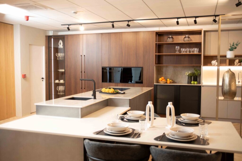 El showroom se plantea como un entorno donde el profesional puede comparar tipologías, tocar materiales, evaluar sistemas de apertura y almacenaje, y ver cómo la tecnología se integra sin renunciar a la estética