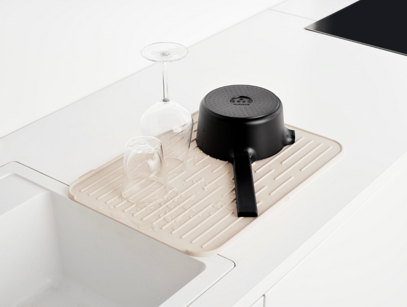 Los escurreplatos de la colección, disponibles en distintos formatos, han sido diseñados para adaptarse a diferentes espacios y volúmenes de vajilla, favoreciendo un secado eficiente y ordenado. Las alfombrillas escurreplatos, tanto en silicona como en microfibra, completan esta función con soluciones flexibles, absorbentes y fáciles de guardar.