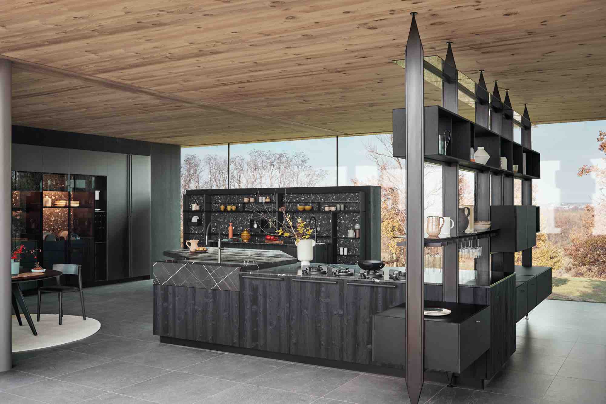 Esa misma búsqueda de integración se traslada al corazón de la casa a través de la isla Maxima en Tabià Nero y del sistema bifacial The 50’s, que actúa como un elemento arquitectónico ligero, capaz de separar cocina y salón sin interrumpir la continuidad visual. La madera elegida para Maxima procede de antiguas construcciones alpinas, los tradicionales Tabià, recuperadas y tratadas mediante arenado para resaltar las huellas del tiempo. Nudos, vetas y marcas naturales confieren a la superficie una fuerte carga material, auténtica y expresiva.