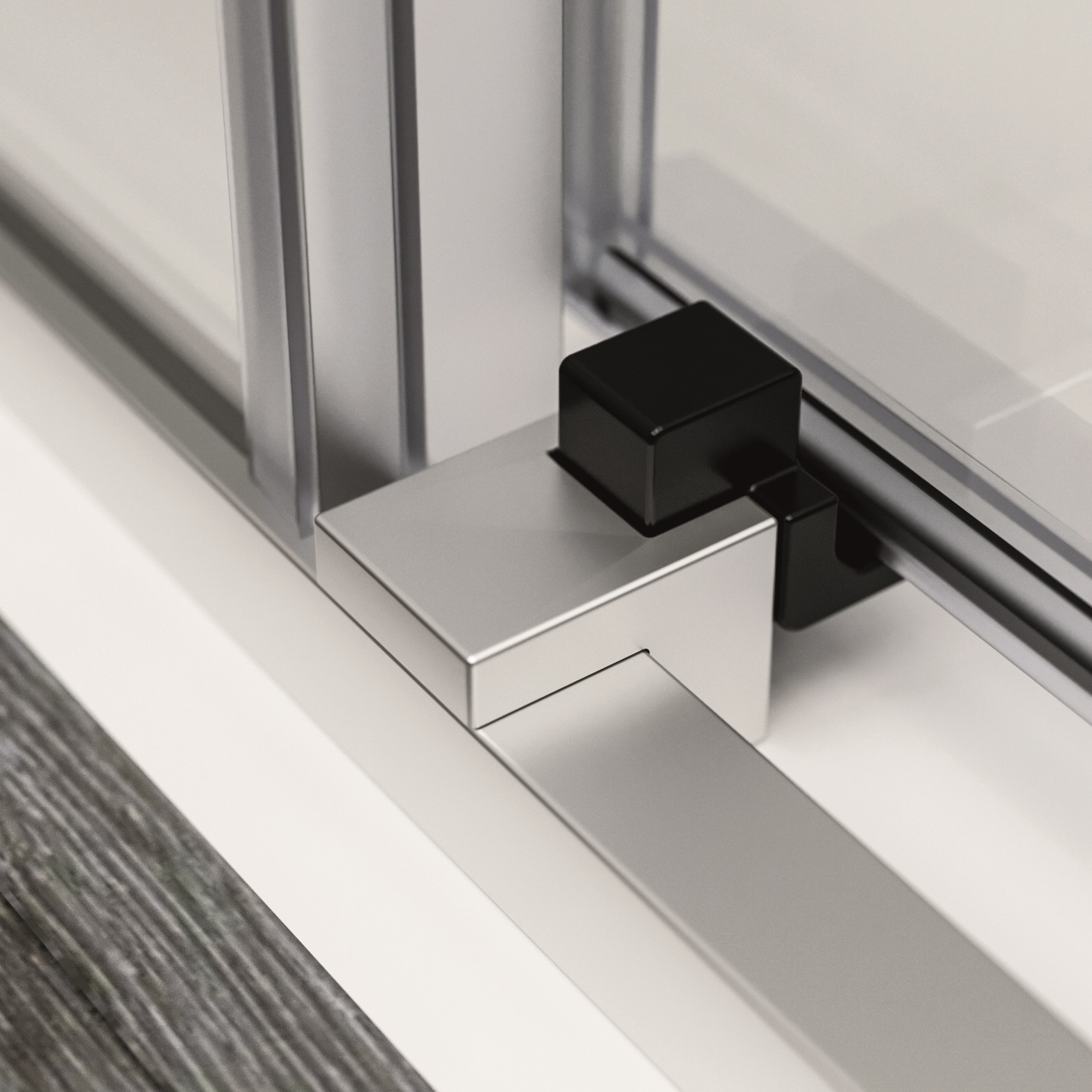 El cuidado por el detalle se define en cada elemento . La unión de los perfiles superiores a 45 grados y e l cristal fijo, integrado con perfile ría de aluminio del mismo grosor que la puerta, garantiza una armonía formal impecable.