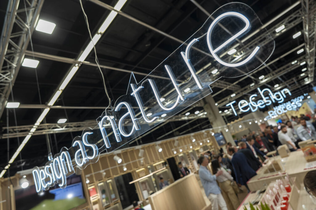 5. Design as nature: muestra del ciclo forestal y los pilares de sostenibilidad de Finsa, basados en sellos y certficaciones de terceros como PEFC, FSC, EPDs, Cradle to Cradle, Declare o Ecolabel. También se detallan las nuevas marcas de Finsa dedicadas a cerrar el círculo: Veta (gestión forestal) y Evolta (recuperación y reciclaje).