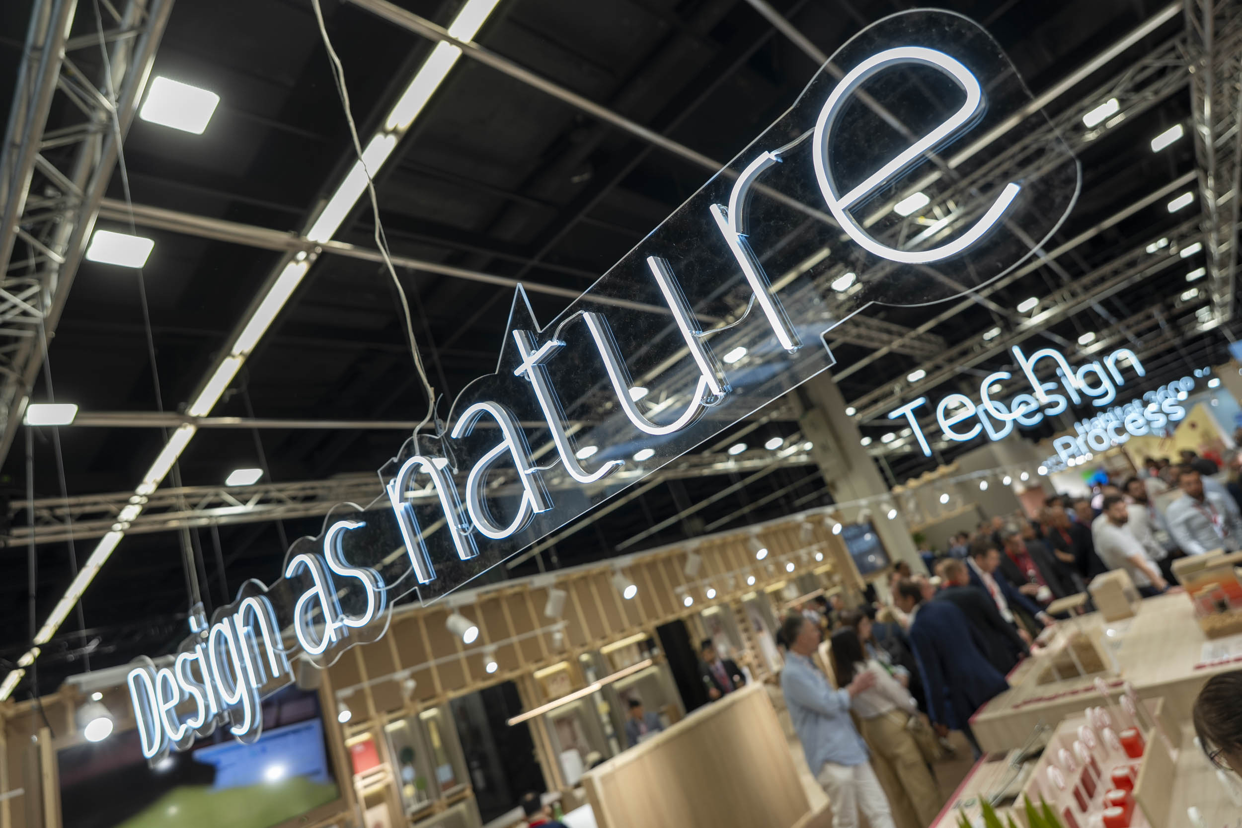 El estand está realizado en su envolvente por un material innovador como es Fibrapan BIO, el tablero de fibras de densidad media con mayores componentes naturales del mercado (superior al 99%, a partir de la corteza del propio árbol). Para facilitar el recorrido de la materia prima al diseño, el estand se compone de cinco zonas: