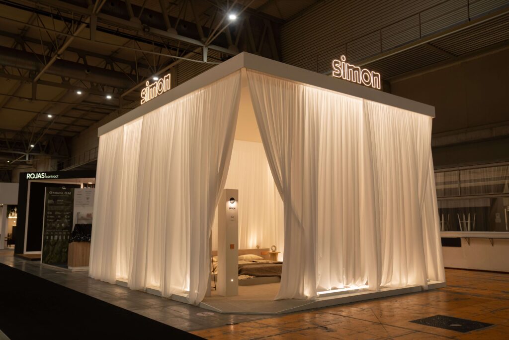 Con esta filosofía, Simon refuerza su compromiso con el sector hotelero presentando “The Invisible Host: A Smart Room Story”, un stand convertido en experiencia inmersiva que trasciende la simple exhibición de producto. Desarrollado junto al estudio YSLA · Strategic Creative Firm en colaboración con Bilateral Arquitectos, este espacio es más que una habitación: es una escenografía funcional y emocional, un volumen de líneas puras donde cortinas tensadas filtran la luz y modulan atmósferas envolventes. Aquí, cada detalle, iluminación, climatización y control ambiental, está diseñado para anticiparse al huésped con discreción, sin que se perciba la tecnología que sostiene el confort.