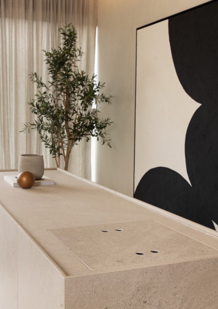 La tecnología se integra de forma casi invisible para preservar la limpieza visual del conjunto. La inducción invisible, sin disipador calórico, permite cocinar, preparar y servir sobre una misma superficie continua. La zona de aguas, completamente esculpida en MDi y ocultable, refuerza la versatilidad del diseño y su capacidad de adaptación a distintos momentos y usos.