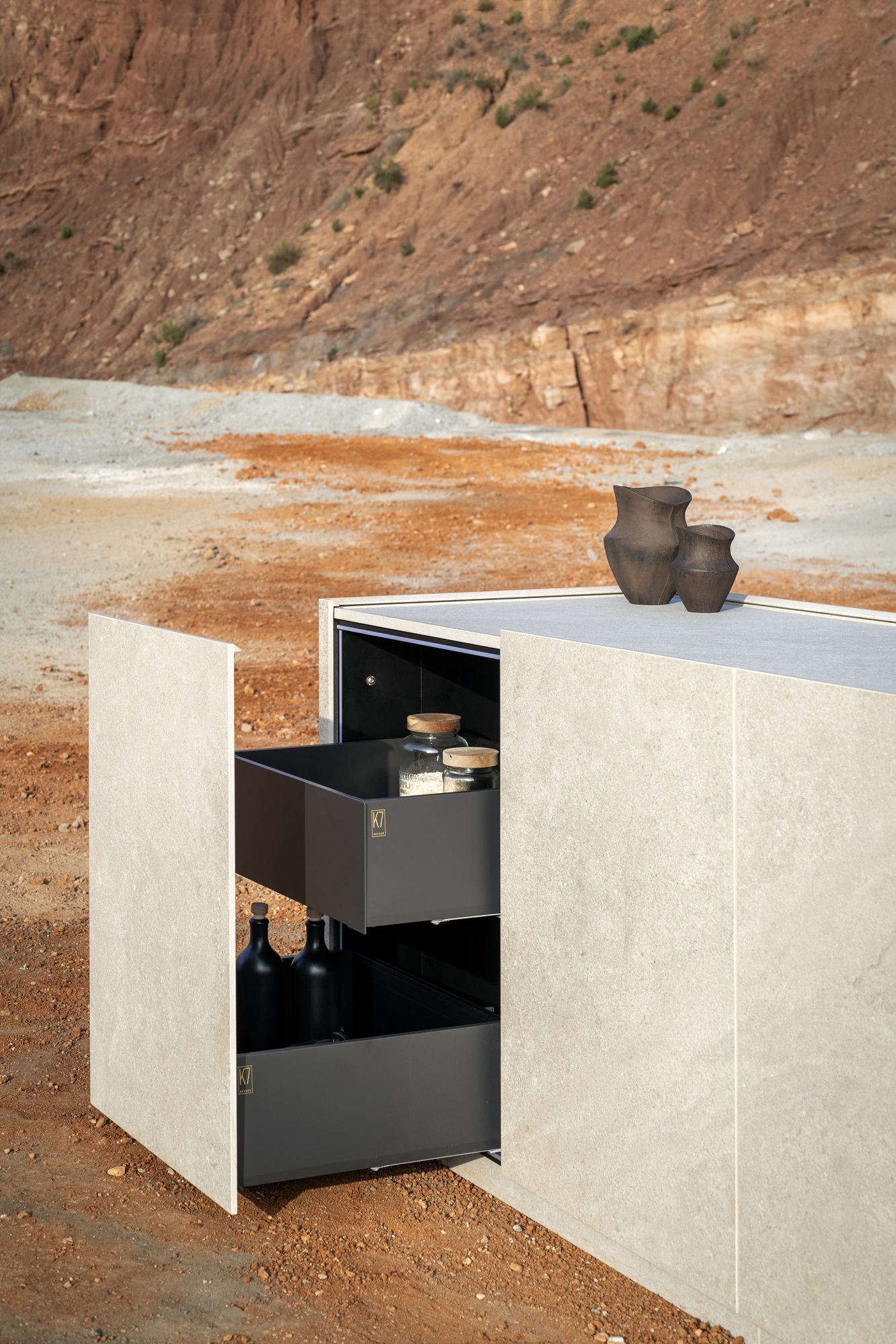 En este contexto, The Rok encarna la máxima expresión de esta filosofía. Una cocina monolítica, de presencia escultórica, que sintetiza la esencia de la marca : pureza formal, innovación técnica y una profunda conexión con la materia. Su diseño sobrio y atemporal permite una integración armónica tanto en interiores sofisticados como en entornos abiertos, donde el paisaje se convierte en parte del proyecto.