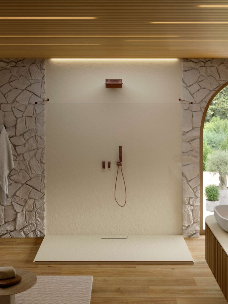 Sustituir la bañera por un plato de ducha no solo libera metros visuales y aporta ligereza al conjunto, sino que también mejora la accesibilidad y adapta el espacio a nuevas necesidades de uso. Para que esta transformación resulte sencilla, Acquabella plantea la combinación de sus platos de ducha fabricados en Akron® junto con el panel Slim, creando una solución integral que reduce tiempos de obra y simplifica la intervención. Los platos de ducha destacan por su resistencia, propiedades antideslizantes y amplia variedad de medidas y acabados, lo que permite adaptarlos a distintos espacios y estilos. Propuestas como Kos Slate o Base Slate aportan una textura inspirada en la pizarra que refuerza el carácter natural del baño, mientras que modelos como Livo Slate introducen una geometría precisa con una ligera pendiente que dirige el agua hacia un desagüe circular desplazado, combinando funcionalidad y diseño contemporáneo. Alternativas como Flow Zero o Acqua Zero apuestan por superficies continuas y soluciones integradas que favorecen una estética limpia y equilibrada.