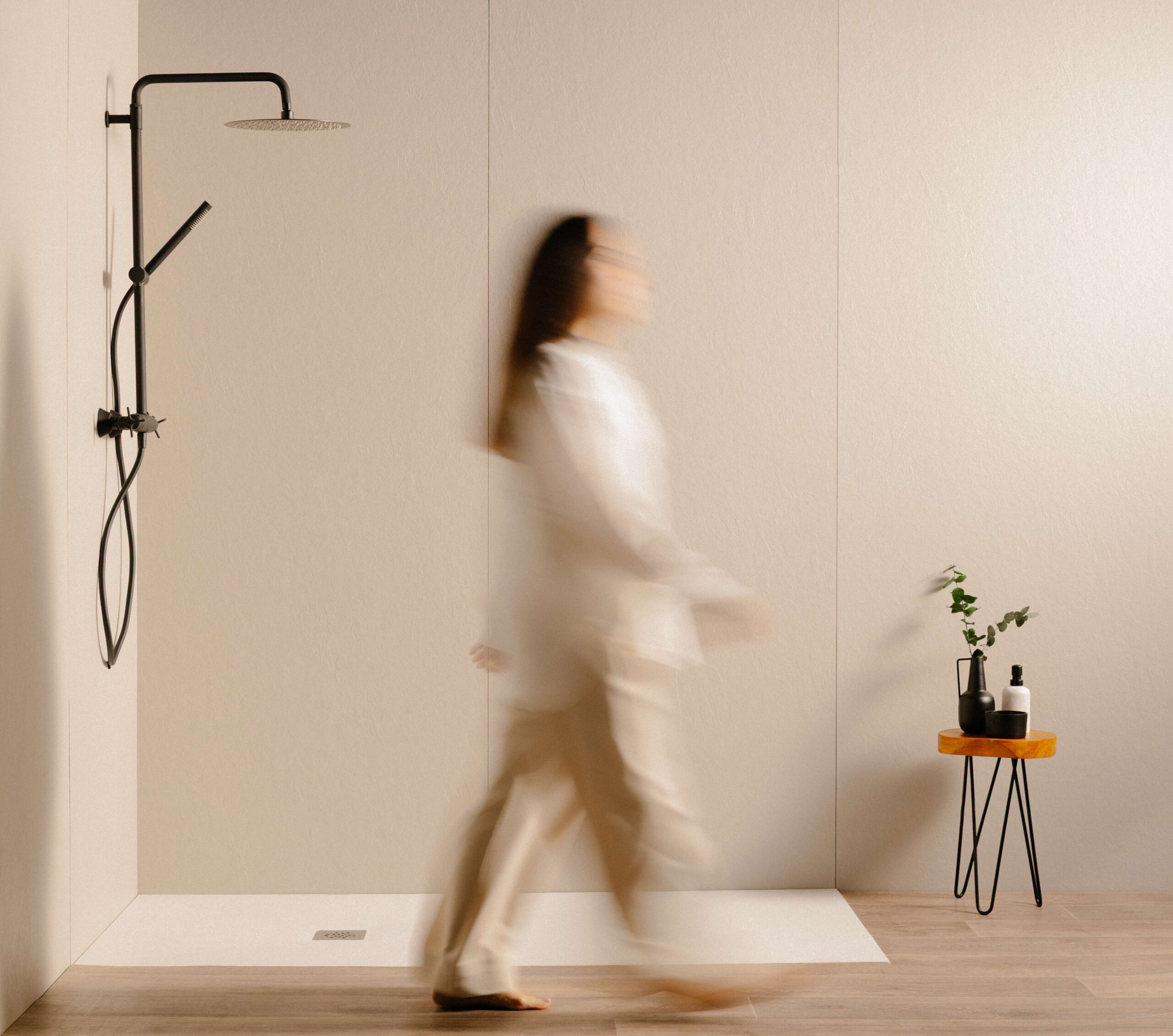 El sistema se completa con el panel Slim, un revestimiento ultrafino de solo 3 mm de grosor y un peso un 50% inferior al de otros paneles, diseñado para instalarse directamente sobre azulejos existentes. Esta característica permite evitar demoliciones innecesarias, reducir el tiempo de instalación y lograr una renovación más ágil, minimizando molestias durante la obra.
