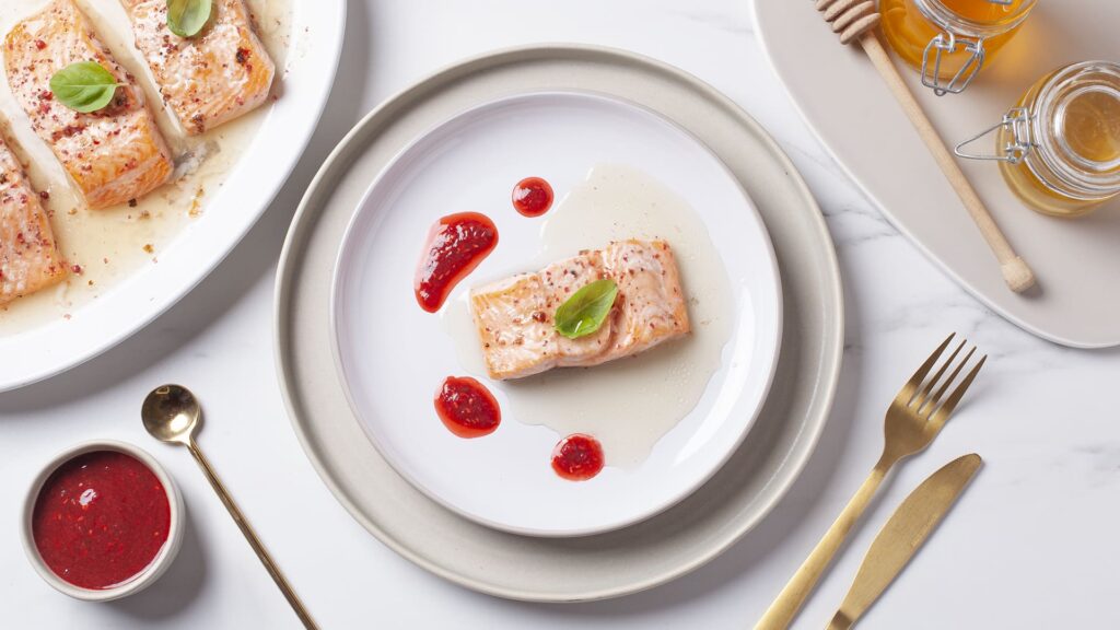 Un ejemplo es el  salmón al vapor glaseado con miel, lima y frambuesas, una propuesta donde la precisión en la cocción es clave. En este caso, la tecnología 6th Sense, combinada con la función Pure Steam de la gama W Collection, permite al horno gestionar automáticamente las condiciones óptimas de cocción.